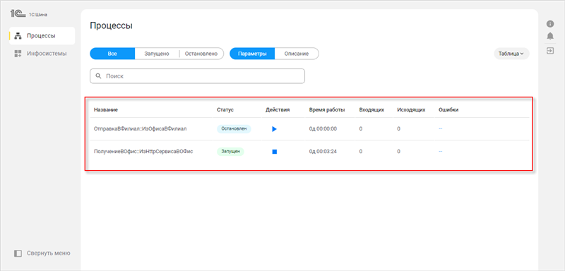 Чтобы отобразить только запущенные либо только остановленные процессы интеграции, выберите соответствующий фильтр: