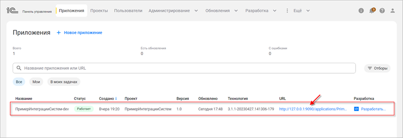 Чтобы перейти в пользовательский интерфейс «1С:Шины», откройте страницу приложения. Для этого в панели управления во вкладке Приложение выберите нужное и откройте его URL: