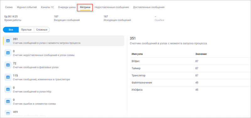 Во вкладке Метрики можно отслеживать значения предустановленных метрик процесса интеграции: