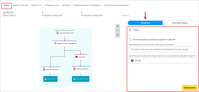 Во вкладке Недоставленные сообщения вы можете увидеть все сообщения, которые попали в канал недоставленных сообщений. Недоставленные сообщения хранятся определенное время, которое можно настраивать (по умолчанию — 7 дней). Вы можете посмотреть эти сообщения в списке или каждое отдельно, можете выгрузить сообщение в виде файла, а также выполнить доставку такого сообщения в выбранный узел схемы (см. Работа с недоставленными сообщениями).