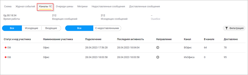Во вкладке Каналы 1С вы можете наблюдать детальную статистику числа отправленных и полученных сообщений (в разрезе каналов). Есть возможность вывести на экран только входящие либо только исходящие каналы, просматривать отдельно каналы с недоставленными сообщениями, а также фильтровать каналы по нужному вам условию: