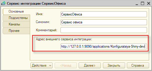Вернитесь в конфигуратор и установите скопированный адрес в качестве значения свойства Адрес внешнего сервиса интеграции: