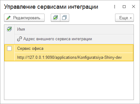 В списке доступных сервисов интеграции вы увидите единственную запись Сервис офиса — этот тот самый сервис интеграции, который вы создали в конфигураторе (добавление и удаление сервисов в режиме «1С:Предприятие» не поддерживается).