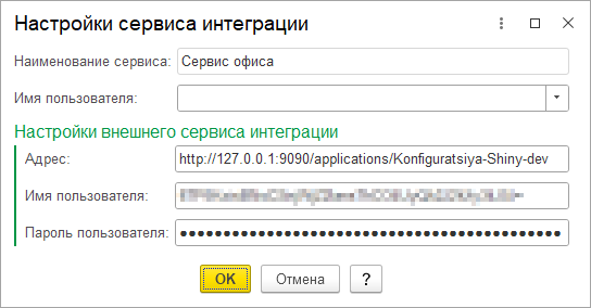 В группе Настройки внешнего сервиса интеграции задайте свойства: