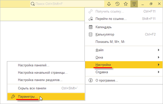 Для этого кликните на символ выпадающего списка в правом верхнем углу и перейдите в ра здел Настройки ⟶ Параметры...: