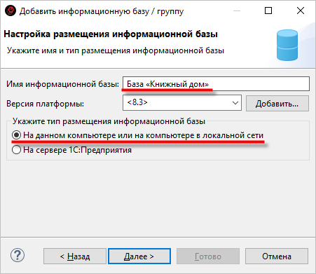 Введите название информационной базы. Тип размещения файла выберите На данном компьютере или на компьютере в локальной сети. Нажмите Далее: