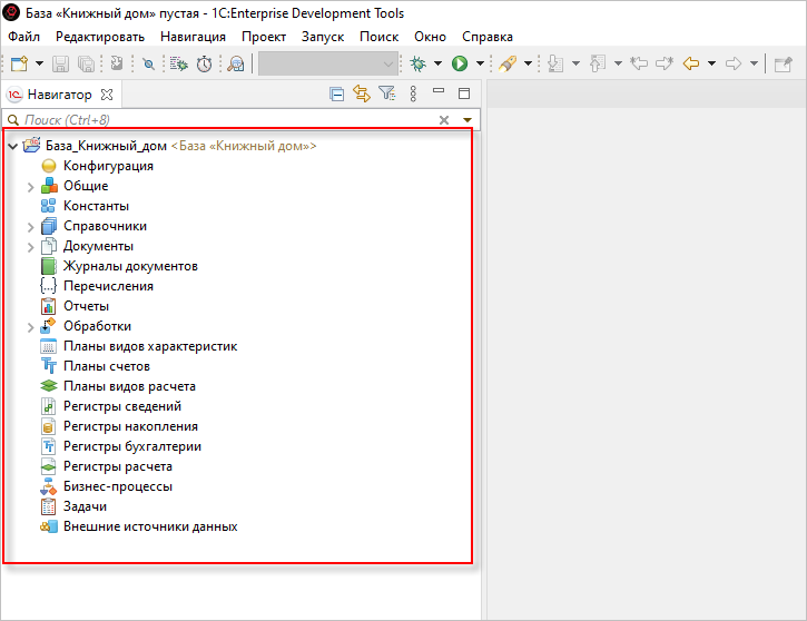 После загрузки конфигурация базы отобразится слева в окне Навигатор:
