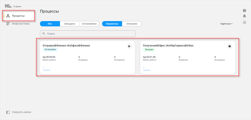 На главной странице, во вкладке Процессы, в виде карточек отображаются все существующие в приложении процессы интеграции: