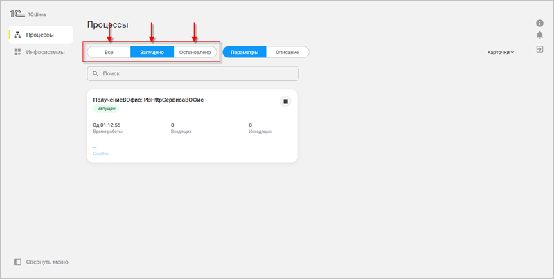 Чтобы отобразить только запущенные либо только остановленные процессы интеграции, выберите соответствующий фильтр: