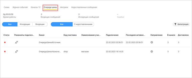 Для каналов вида «Канал1СИсточник» колонка В канале показывает, сколько сообщений уже получено сервером, но еще не обработано. Колонка Доставлено показывает, сколько сообщений забрано «Шиной» на обработку.