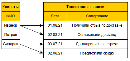 В приложении элементы одного справочника могут быть связаны с элементами другого справочника. Например, есть справочник Клиенты и есть справочник ТелефонныеЗвонки, в котором фиксируется дата, продолжительность и содержание телефонных разговоров с клиентами. Тогда каждый телефонный звонок будет связан с каким-то одним клиентом и для каждого клиента будет известен список телефонных разговоров с ним.