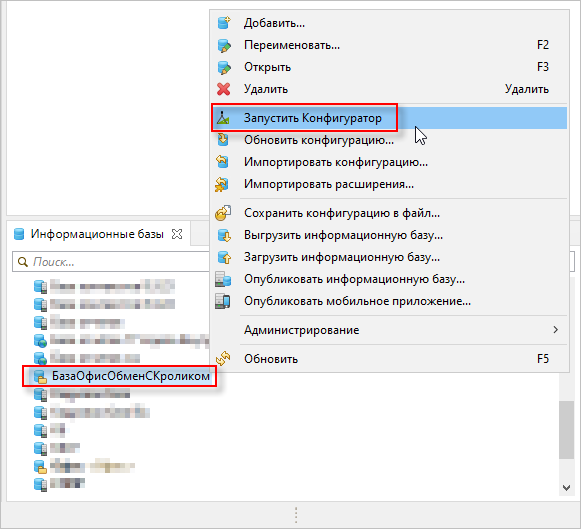 2. Найдите в списке информационных баз ту, в которой необходимо обновить конфигурацию (в примере — БазаОфисОбменСКроликом). Нажмите на нее правой кнопкой мыши и выберите Обновить конфигурацию: