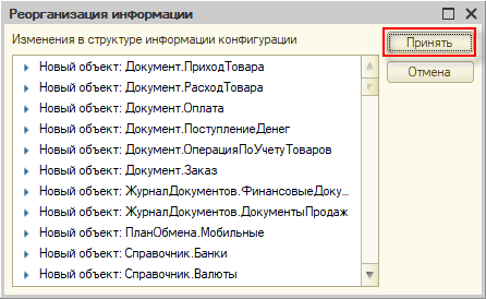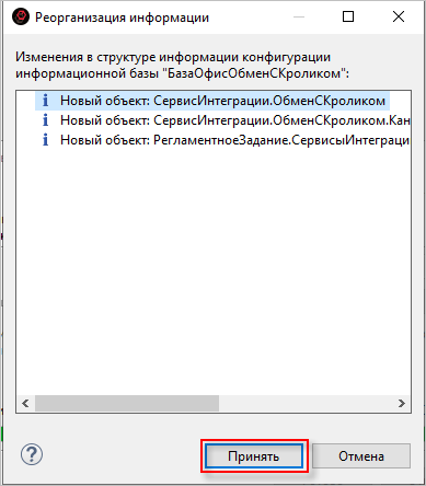 17. Конфигуратор сообщит о том, что будет выполнена реструктуризация базы данных, нажмите Принять: