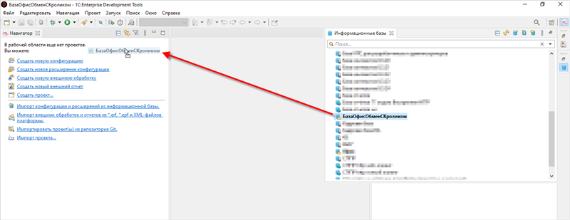 18. Вернитесь в «1С:EDT». Следующим шагом в панели Информационные базы выберите базу с той конфигурацией, разработку которой вы хотите перевести в «1C:EDT». Перетащите эту информационную базу в панель Навигатор: