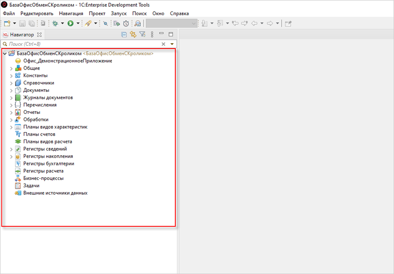 20. После загрузки конфигурация базы отобразится слева в окне Навигатор: