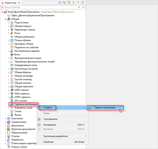 1. Добавьте сервис интеграции с именем ОбменСКроликом. Для этого откройте вкладку Общее, затем правой кнопкой мыши нажмите Сервисы интеграции, в контекстном меню выберите СоздатьСервис интеграции: