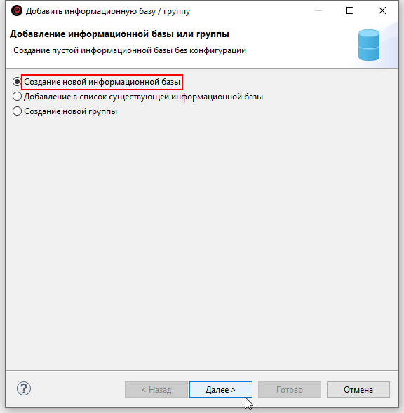 8. Система автоматически предложит вам каталог для сохранения информационной базы. Его можно оставить без изменений. Нажмите Далее: