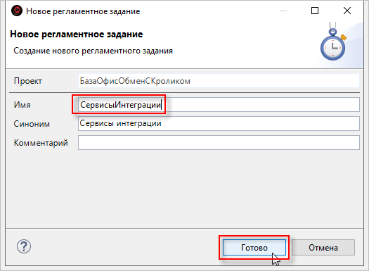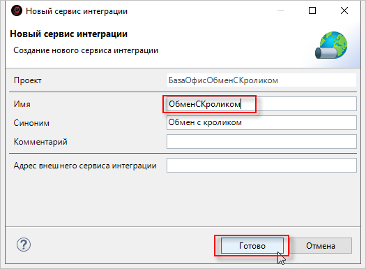 2. Заполните имя для сервиса интеграции. Нажмите Готово: