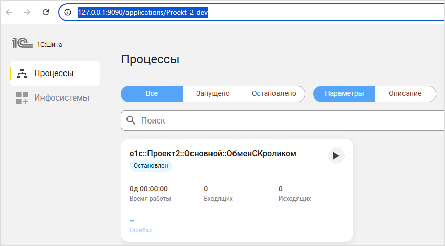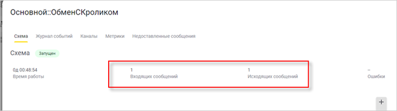3. Проверьте, что в панели управления «1С:Шины» увеличилось количество входящих и исходящих сообщений: