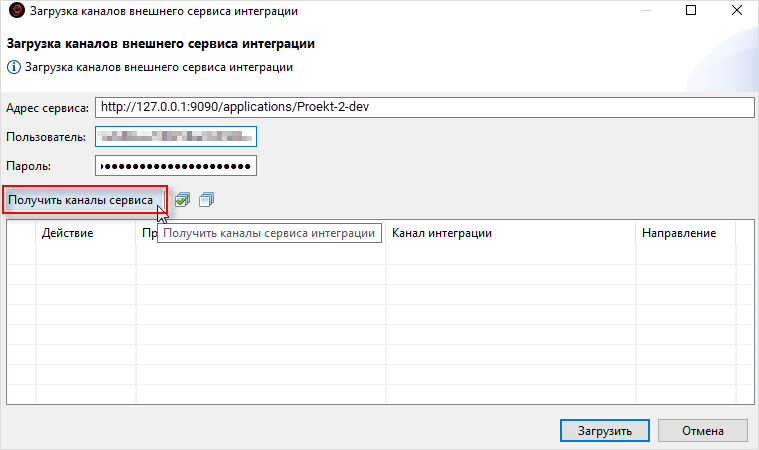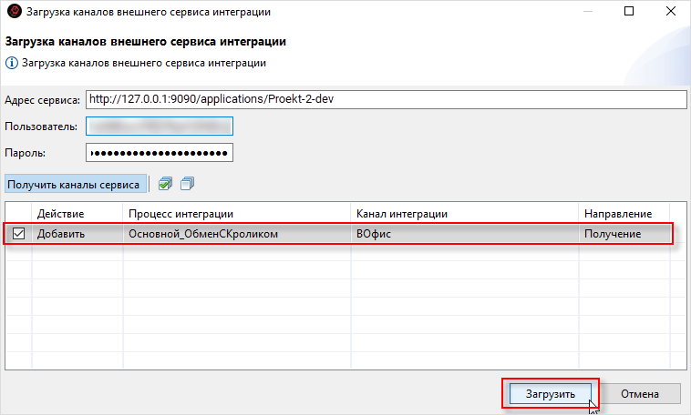 7. В списке отобразится канал из схемы процесса интеграции. Убедитесь, что рядом с ним стоит галочка и нажмите Загрузить: