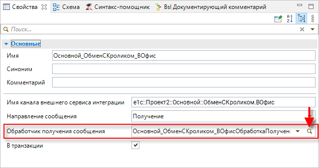 9. Затем, в панели Свойства, в поле Обработчик получения сообщения кликните на значок лупы. Перед вами откроется окно обработчика получения сообщения канала Основной_ОбменСКроликом_ВОфисОбработкаПолученияСообщения: