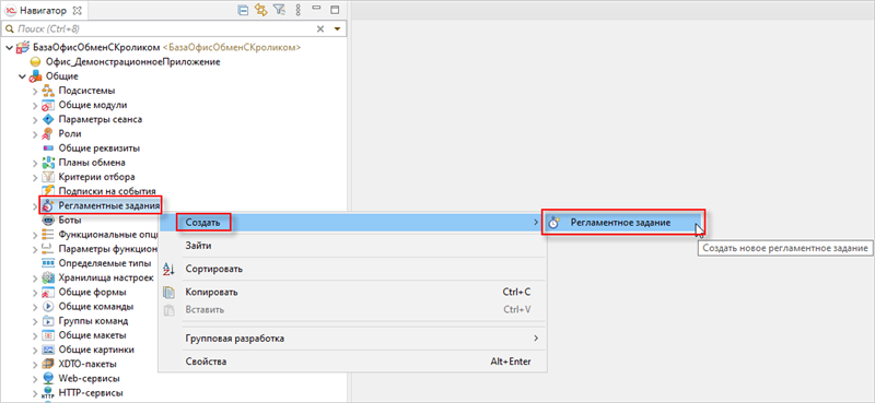 11. Создайте регламентное задание с именем СервисыИнтеграции. Для этого правой кнопкой мыши нажмите на Регламентные задание в панели Навигатор и выберите СоздатьРегламентное задание: