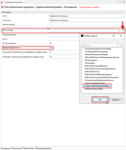 13. Откроется окно редактора. Поставьте галочкуПредопределенное. В поле Имя метода нажмите на значок лупы и в открывшемся списке выберите уже имеющийся обработчик СервисыИнтеграцииСервер. Нажмите ОК: