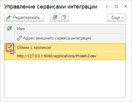 3. В списке доступных сервисов интеграции вы увидите единственную запись Обмен с кроликом — этот тот самый сервис интеграции, который вы создали в «1C:EDT». Чтобы настроить подключение к серверу «1С:Шины», нажмите правой кнопкой мыши на сервис и выберите Редактировать: