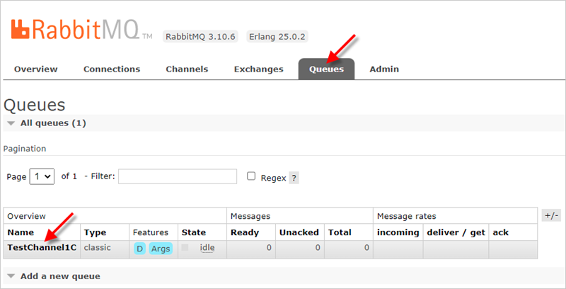 • Перейдите на вкладку Queues and Streams. Нажмите на ссылку Add a new queue. Заполните поле Name, введя название очереди TestChannel1C, и нажмите Add queue: