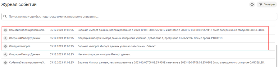 - Все действия импорта проходят в одной операции журнала событий. Эта операция описана событиями типа ОперацияИмпортДанных.