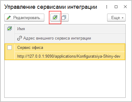 В списке доступных сервисов интеграции вы увидите единственную запись Сервис офиса — этот тот самый сервис интеграции, который вы создали в конфигураторе (добавление и удаление сервисов в режиме «1С:Предприятие» не поддерживается).