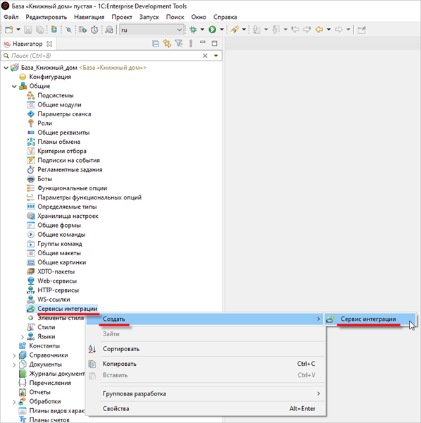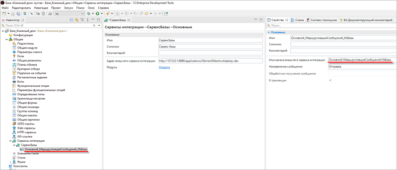 ...Демонстрационные примерыПример 6. Маршрутизация и трансформация сообщенийНастройка информационной базы «1С:Предприятие»Добавление сервиса интеграцииСодержание этой страницыДобавление сервиса интеграции в информационные базы «1С:Предприятия 8» На этом этапе вы добавите в информационную базу объект конфигурации вида Сервис интеграции. Добавление сервиса интеграции в информационную базы «1С:Предприятия 8»