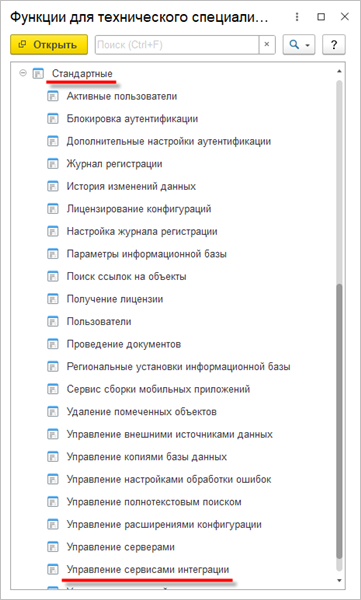 Разверните ветку Стандартные и откройте Управление сервисами интеграции: