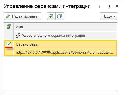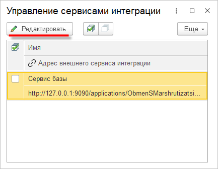 В списке доступных сервисов интеграции вы увидите единственную запись Сервис базы — это тот самый сервис интеграции, который вы создали в «1С:EDT». Чтобы настроить подключение к серверу «1С:Шины», нажмите Редактировать:
