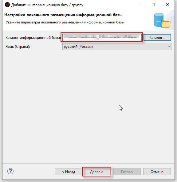 Система автоматически предложит вам каталог для сохранения информационной базы. Его можно оставить без изменений. Нажмите Далее:
