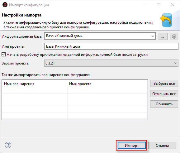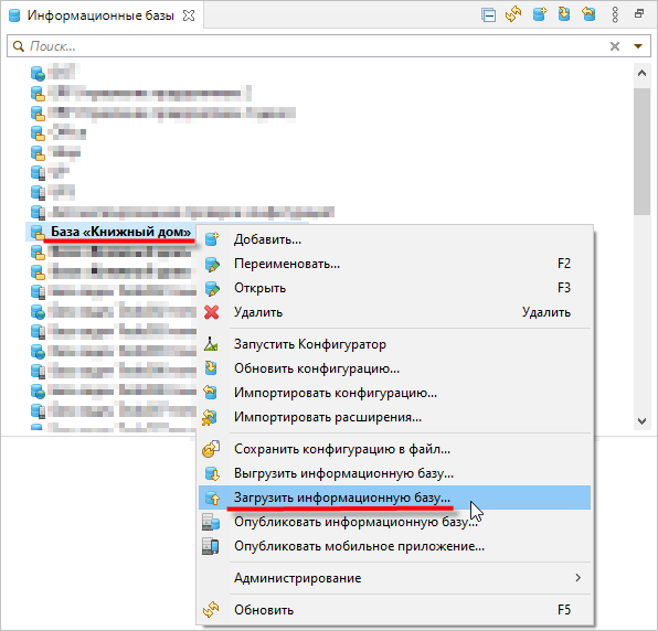 Далее в созданную пустую информационную базу следует загрузить шаблон информационной базы. Для этого кликните правой кнопкой мыши на созданную информационную базу (в примере: База «Книжный дом»). Затем выберите Загрузить информационную базу...: