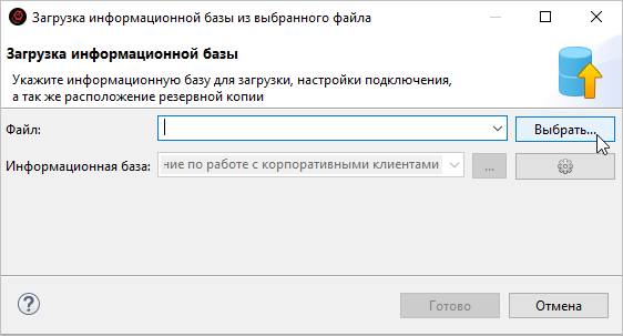 В открывшемся окне нажмите Выбрать и выберите файл с примером информационной базы. Затем нажмите Готово: