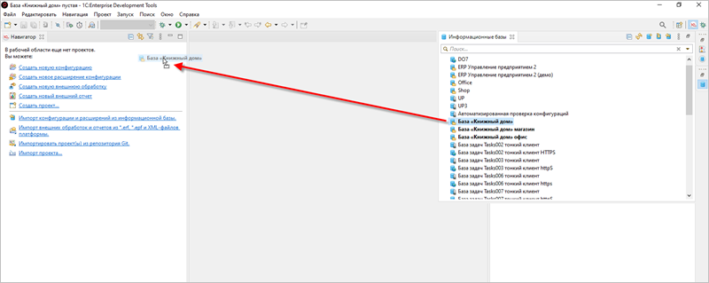 Следующим шагом в панели Информационные базы выберите базу с той конфигурацией, разработку которой вы хотите перевести в «1C:EDT». Перетащите эту информационную базу в панель Навигатор: