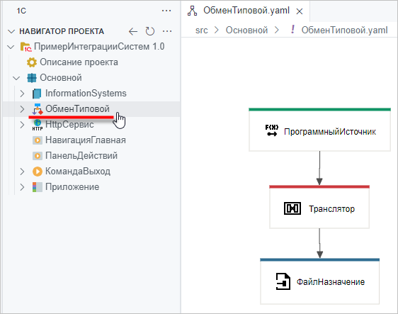 Откройте схему процесса интеграции. Для этого кликните на элемент проекта ПроцессИнтеграции в панели навигатора (в примере элемент назван ОбменТиповой):