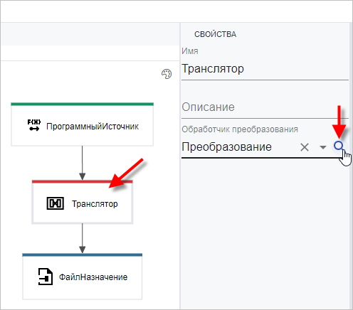 Откроется схема процесса интеграции. На схеме выберите узел Транслятор и в свойствах узла в поле Обработчик преобразования нажмите на значок лупы:
