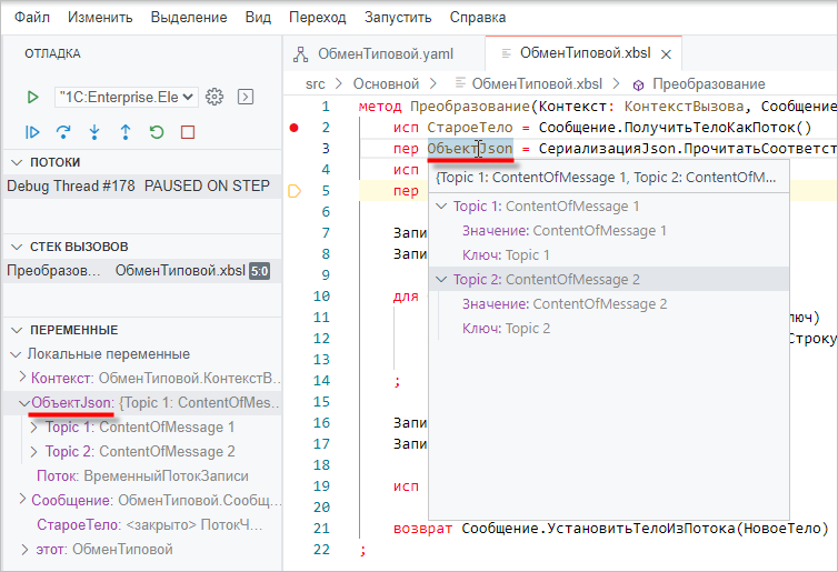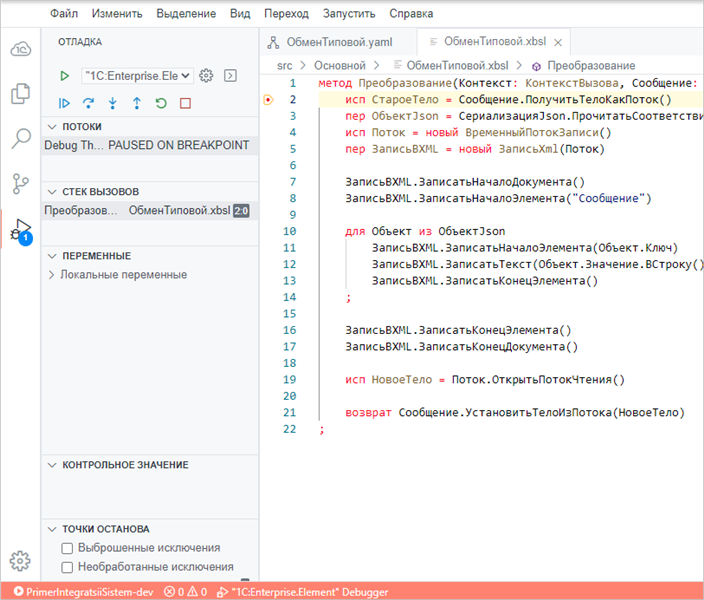 В этом примере вы запустите проект в режиме отладки и после остановки на точке останова продолжите пошаговое исполнение приложения. В качестве примера будет исследован процесс обработки входящего сообщения в узле Транслятор. Сообщения в «1С:Шине» в данном примере будут поступать по протоколу HTTP в результате POST-запроса. POST-запрос будет осуществляться по специальному URL-шаблону, который был ранее определен в HTTP-сервисе «1С:Шины».