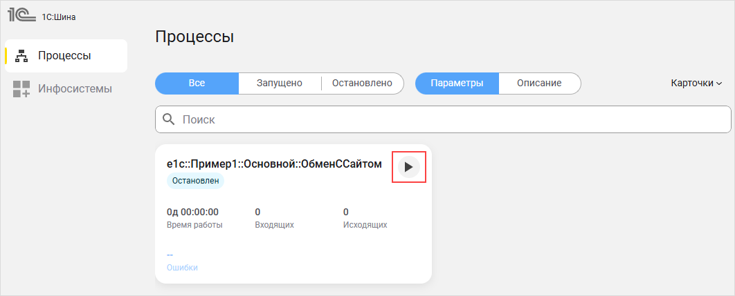 Вы можете запустить процесс интеграции на странице приложения «1С:Шины». Для этого перейдите на страницу приложения, в списке выберите процесс интеграции и нажмите иконку Пуск: