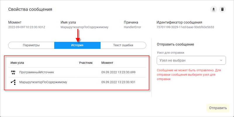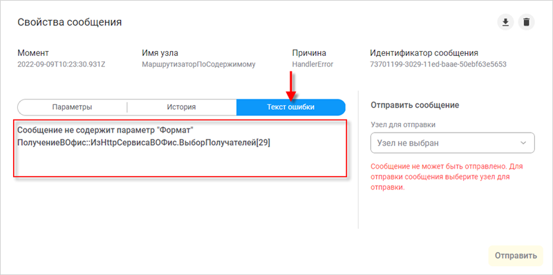- Возникла ошибка в процессе маршрутизации (например, обработчик узла-маршрутизатора вернул неправильный узел или в свойстве сообщения указан неправильный получатель);