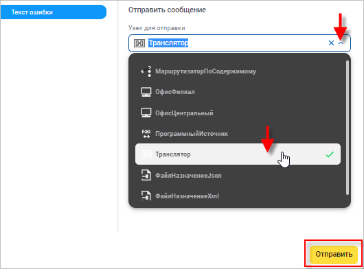 Вы можете отправить сообщение в узел схемы вручную. Для этого в правой части окна свойств выберите в выпадающем списке нужный узел и нажмите Отправить: